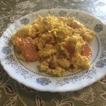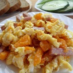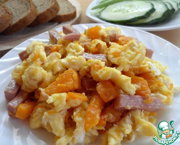 Перемешиваю колбасу с тыквой, и заливаю всё яичной смесью. Слегка перемешиваю в ходе жарки.