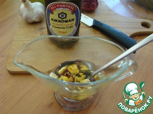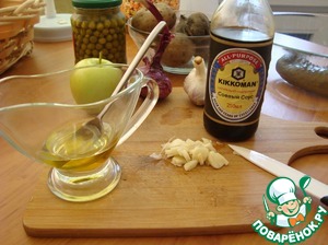 Выкладываем чеснок в масло и наливаем соевый соус. Перемешиваем и даём настояться, пока будем делать винегрет.