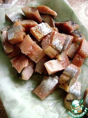 Непотрошеную селедку разделать на чистое филе и нарезать кусочками. Сохранить икру и молоки, снять с них лишние пленки.