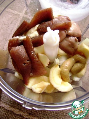 В чашу блендера выложить икру и молоки, добавить нарезанные лук и очищенное яблоко, добавить лимонный сок и горчицу, всыпать ложечку пудры.