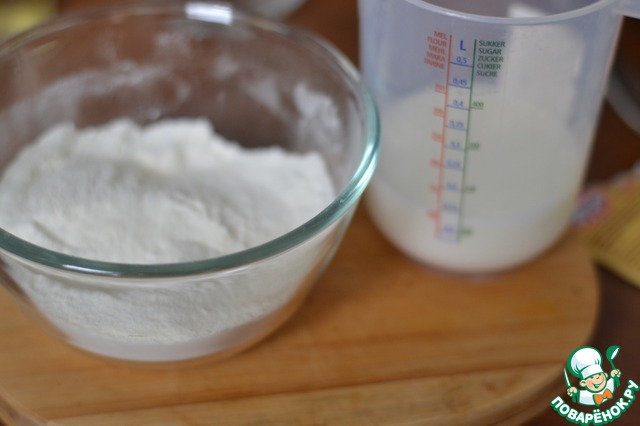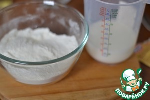 Добавить молоко, муку, смешанную с разрыхлителем.