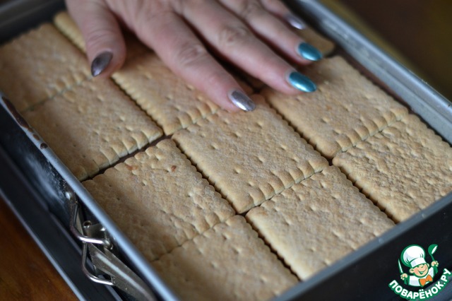 Сверху, на пудинг выкладываем сливочное белое печенье, в один слой.