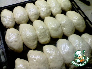 Противень с формированными пирожками снова накрыть плёнкой (полотенцем) и снова оставить в тёплом месте на 1 час.