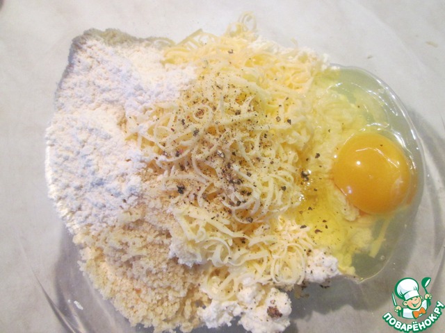 В миске разомните вилкой творог, добавьте натертый сыр, хлебную крошку, муку, посолите, поперчите. Все хорошо перемешайте. Накройте миску пленкой и уберите в холодильник, минимум на 30 минут.