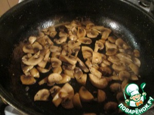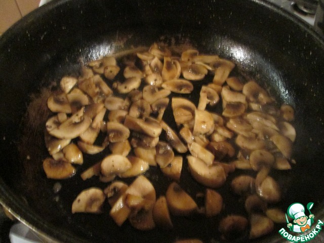 Дав яйца сварите вкрутую. Грибы порежьте тонкими ломтиками и обжарьте на растительном масле до готовности.