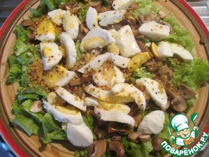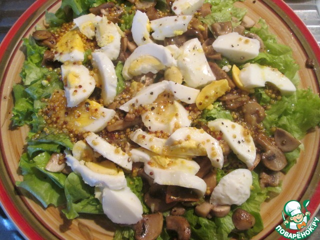 Приготовьте заправку. На блюдо выложите листья салата ( крупно порезанные или порванные руками ), сверху обжаренные грибы, затем порезанные яйца. Полейте заправкой.