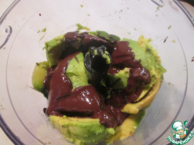 • Надрезать авокадо вдоль пополам, разъединить половинки круговым движением, вынуть косточку и ложкой выбрать мякоть. Растопить шоколад на водяной бане. В чашу блендера выложить кусочки авокадо, вылить растопленный шоколад.