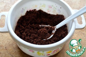 Отсыпать печенье для теста, а в печенье для основы добавить растопленное масло, хорошо перемешать, консистенция будет похожа на мокрый песок;