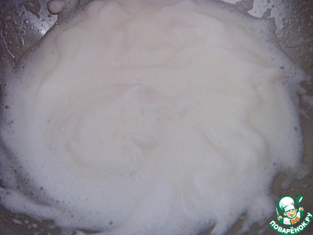 Помешивая венчиком, постепенно влить половину кипящего молока.