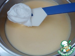 Всыпать 40 г. сахарной пудры, хорошо взбить и в три этапа примешать белки к общей массе. Перемешивать лопаточкой. очень аккуратно, чтобы сохранить воздушность.