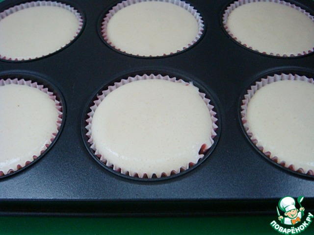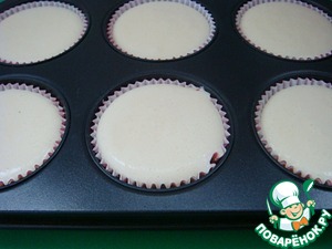 Заполнить тестом бумажные капсулы, установленные в форму для кексов.