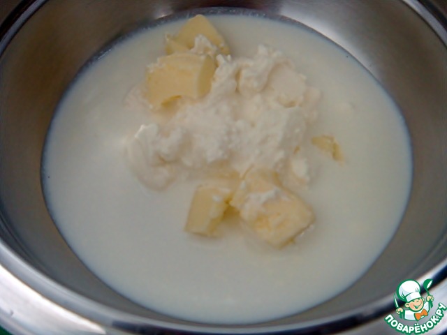 Соединить в огнеупорной миске молоко, сливочное масло и крем-чиз ( или любой другой сливочный сыр плотной консистенции).