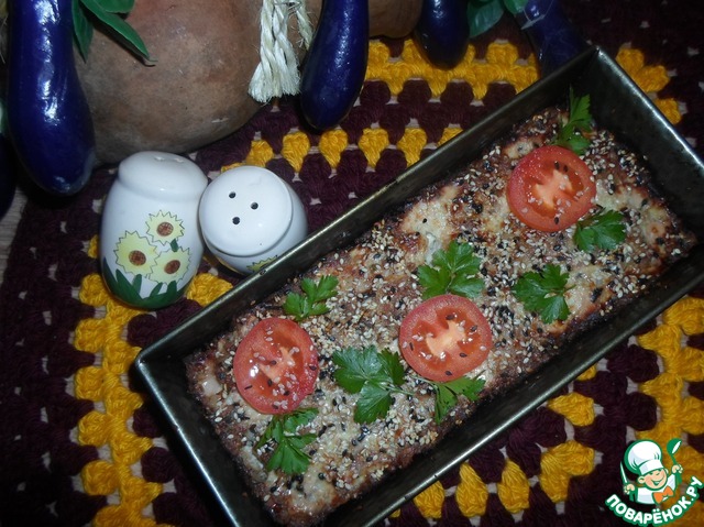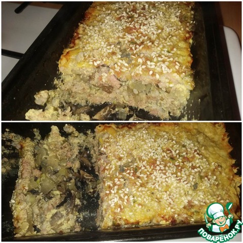 Закрываем оставшимся фаршем и посыпаем кунжутом. Запекаем в разогретой до 200-220 градусов духовке около 40 минут.