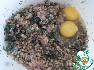 К фаршу добавляем отварную гречку, хмели-сунели, соль, яйца, мелко рубленный укроп, тщательно вымешиваем.