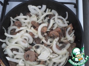 В удобную форму выкладываем фарш, формируем бортики. В середину выкладываем обжаренные с луком грибы.