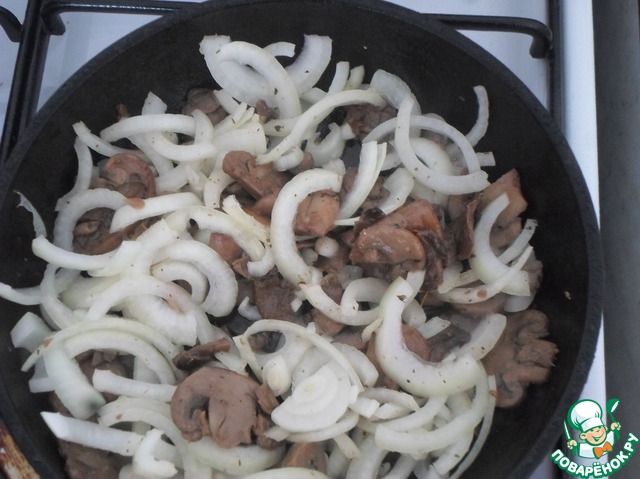 Затем добавляем лук порезанный полукольцами и доводим до готовности.