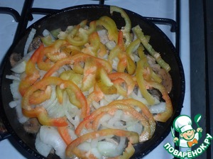 Затем добавляем лук и перец, обжариваем еще 10 минут.