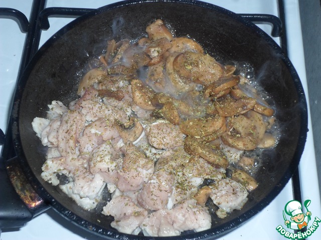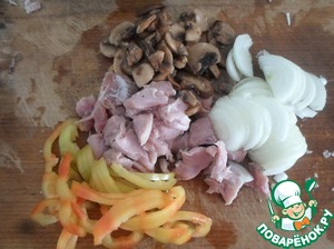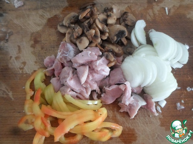 Мясо режем на мелкие кусочки, лук и перец полукольцами, грибы тонкими пластинами.