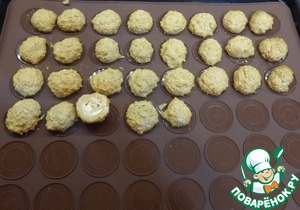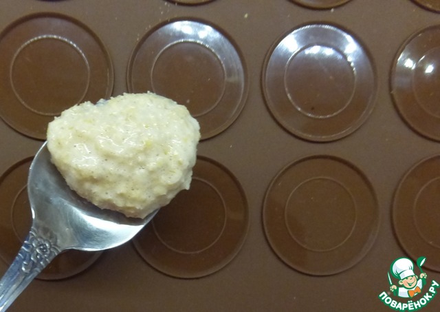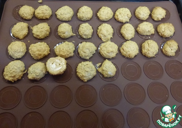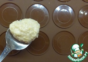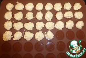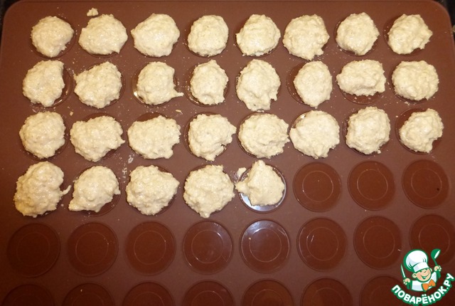 Далее выкладываем на противень. Я пеку на силиконовом коврике. Здесь мне очень удачно пригодился коврик для печенья макаронс - он не дает печенькам расползаться. Если выкладывать просто на коврик, то они, конечно, чуточку разъедутся. Но на вкусе не скажется. Кладем чайной ложечкой, чтобы получился как бы шарик.