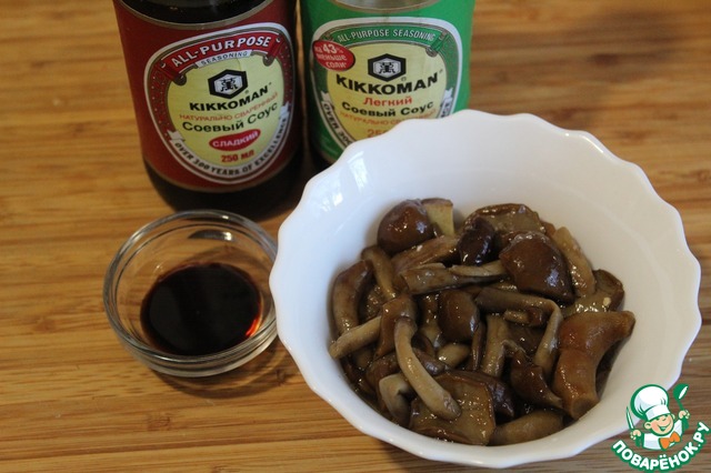 - Соевый соус (из них - ТМ Киккоман, сладкий 1 ч л .ТМ Киккоман, легкий - 1ч л) — 2 ч. л.