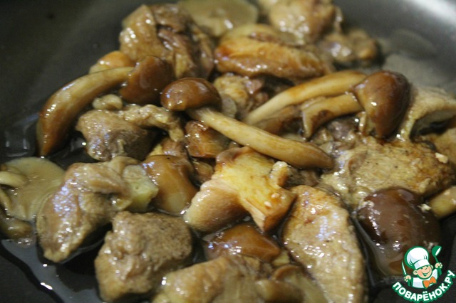 Грибы обжарить на оливковом масле вместе со специями, влить завправку и на сильном огне обжарить до полного выпаривания жидкости, мешая.