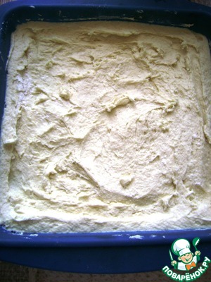 Тесто получается достаточно густое и липкое, и вылить, как рекомендовано в рецепте, его невозможно. Поэтому размазать тесто ровным слоем по форме, формируя невысокие бортики.