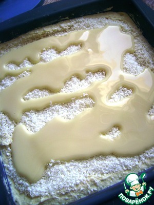 Засыпать тесто ровным слоем кокосовой стружки и полить сгущенным молоком. У меня было маловато стружки – немного больше 200 г. Идти в магазин было лень, но, если б я знала, как это вкусно-я бы бегом побежала. Лень наказуема.