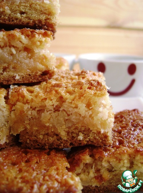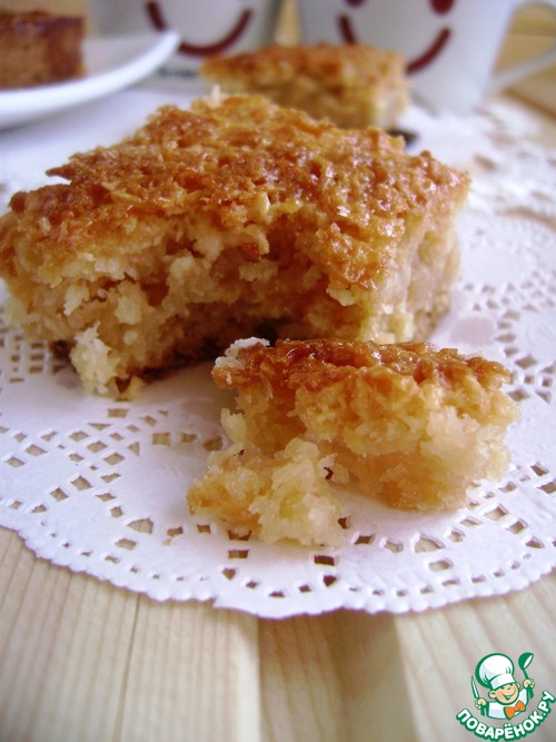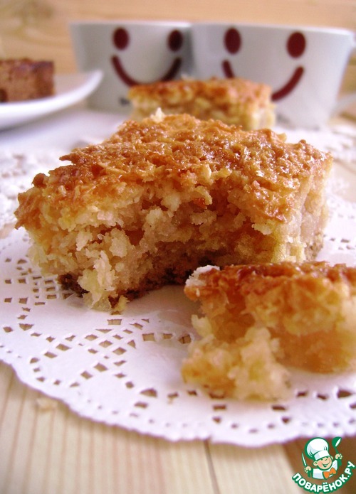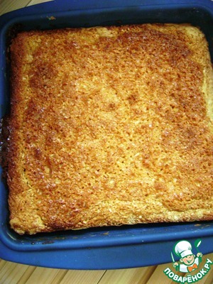 Рекомендуется этот самый кокадос остудить и потом нарезать на квадраты. Я не смогла этого сделать, мне просто не дали. Восхитительный аромат был так хорош, что очередь жаждущих приложиться выждала минут 5-7, только чтобы не обжечься. Края тут же были опробованы. После чего мне пришлось отбиваться и рычать, аки львице, чтобы иметь возможность сделать финальные фото. И это моя заевшаяся семейка!