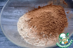 Сухие ингредиенты - муку, у меня уже давно только цернозерновая для выпечки, потому что полезно, но и вкус не отличается от пшеничной, какао и разрыхлитель соединяем.