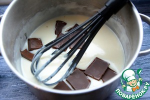 Торт общем не зря Черный лес назвали - пусть будет как в детских страшилках - в одном черном черном городе, делали черный черный торт, и создали черный черный крем... ))) Поэтому добавим плитку темного шоколада в горячий крем, перемешаем, накроем пленкой и в холодильник уберем, чтобы остыл.