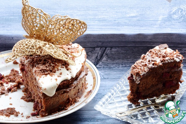 Бисквит нарезать вдоль на 3 части, пропитать низ сиропом, уложить шоколадный крем и вишню. Так собрать и следующий слой. Для верхнего слоя вернулась к истокам, взбила сливки и нанесла сверху.