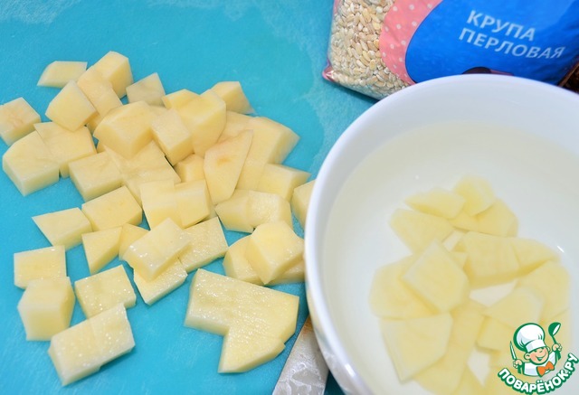 Картофель почистить и нарезать кубиком. Залить холодной водой.