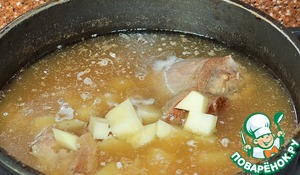 Через 20 минут после погружения перловой крупы, добавить картофель. Проварить 5 минут и посолить. Но имейте в виду, еще будет добавляться квашенная капуста, значит сейчас лучше не досолить. В этот момент можно достать из бульона голяшки. Отложить в сторону.
