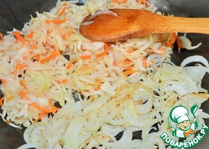 На 1ст. л. разогретого масла обжарить порезанную перьями луковицу, выложить отжатую квашенную капусту. В случае, сильно кислой капусты, промойте ее в проточной воде.