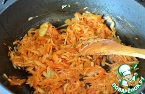 Обжарить 5 минут на среднем огне, помешивая. Добавить томатную пасту и сахар, жарить еще 2 - 3 минуты. Затем влить бульон из казана, погрузив капусту, и тушить 10 - 15 минут.
