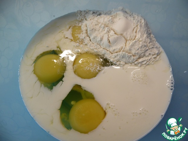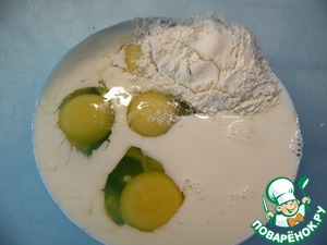 Из яиц, муки, сахара и молока замесить жидкое тесто. Лучше делать это миксером, чтобы не было мучных комочков.