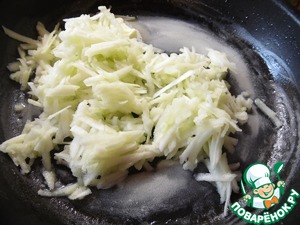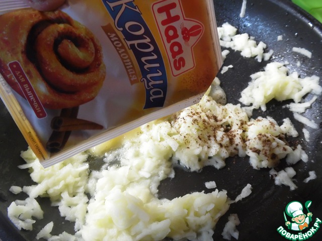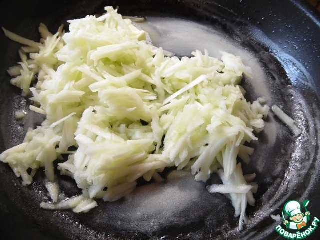 Для начинки. Яблоки натереть на крупной терке, обжарить на сливочном масле 2-3 минуты.