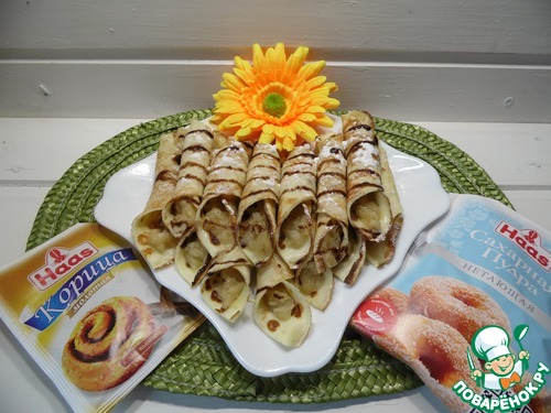 На четвертинки блинчиков, с широкой стороны выложить начинку, свернуть рулетом. Полученные рулеты выложить на блюдо, присыпать сахарной пудрой ТМ "Haas" и украсить шоколадным сиропом.