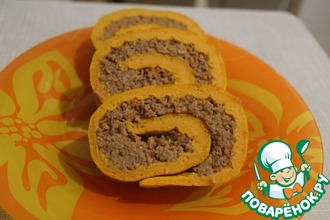 В серединку на тесто тонким слоем распределяем фарш, удобнее всего это делать вилкой, толщина начинки не более 7мм.