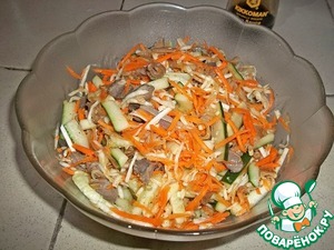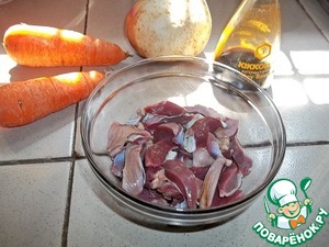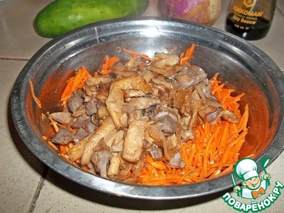 Куриные желудки промыть, обсушить, нарезать тонкой соломкой, залить соевым соусом (2ст. л.), добавить щепотку смеси перцев, перемешать, оставить пока в стороне.