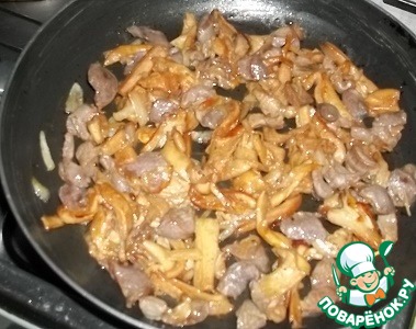 В широкой сковороде (чтобы грибы и куриные желудки обжаривались быстро и равномерно) разогреть 1-2ст. л. масла, добавить грибы, затем лук. Жарить, помешивая минут 5. Добавить куриные желудки вместе с маринадом, жарить до готовности (примерно минут 15). В середине жарки влить лимонный сок и добавить немного соли, так как грибы несоленые.