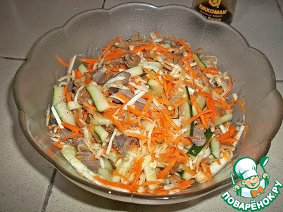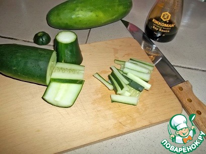Огурец нарезать тонкими брусочками. Соотношение всех овощей в салате должно быть примерно равным.