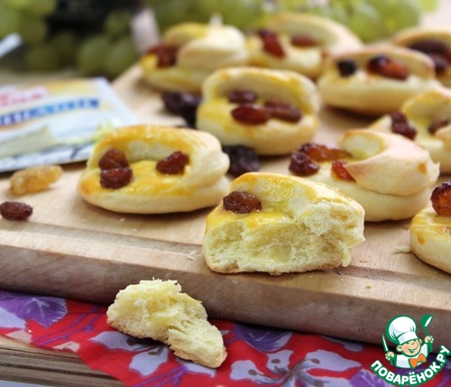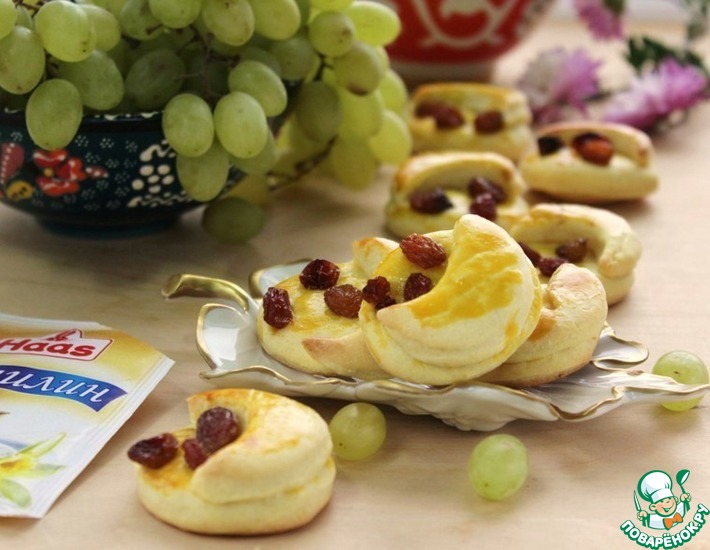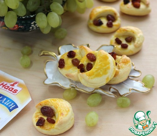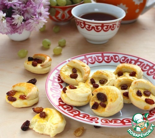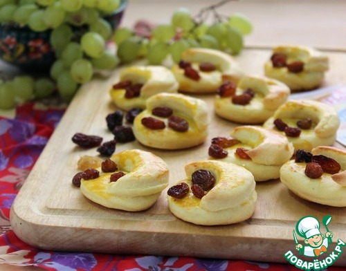 На круглые лепешки выложить полумесяцы. Смазать желтком. Украсить 2-3 изюминками.