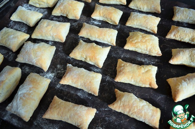 Разморозить тесто, это правильно сделать сначала в холодильнике, затем на столе. Раскатать тесто и нарезать на квадратики. Помните, слоеное тесто раскатывается только в одном направлении.