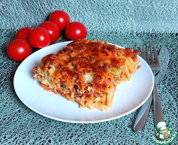 Запеченые макароны с пряным томатным соусом, овощами и сыром.