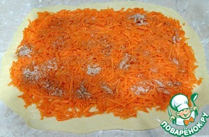 Затем выложить тыкву и распределить по всей поверхности теста. Сверху присыпать сахаром с корицей. -
