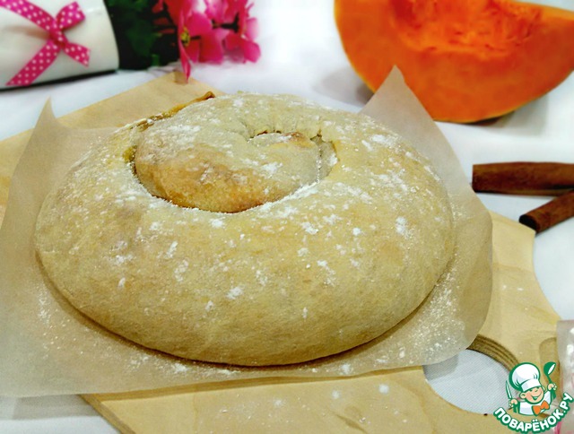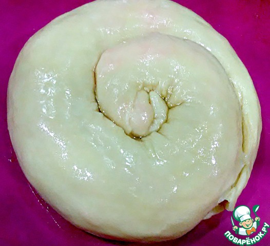 Далее нужно плотно скрутить в рулет, защипать края по шву и свернуть улиткой. Переложить на силиконовый коврик (или смазанный растительным маслом противень), обмазать сверху растопленным сливочным маслом и выпекать в заранее разогретой духовке 45-50 минут при температуре 180 градусов (ориентируйтесь по своей духовке). Вообще вертута обмазывается сверху яйцом, но мне не очень нравится цвет корочки после выпечки, поэтому обмазываю маслом.
