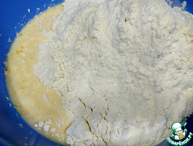 Ввести 2/3 части муки и начать замешивать тесто. Остальную часть муки вводить частями. Мука у всех разная, поэтому может уйти чуть больше или меньше. Мне хватило 150г.
