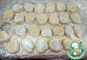 Разложить вареники на доску, застеленную целлофановым пакетом (чтоб не прилипало). Я вареники делаю вечером, замораживаю, а утром на завтрак отвариваю. Если Вы варите сразу, то можете резать жгутики на кусочки и тут же кидать в кипящую воду.