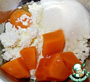 Тыкву приготовить любым удобным для Вас способом. Я отварила в воде с добавлением сахара. Соединить тыкву, яйцо, творог и сахар. Блендером взбить до однородности.